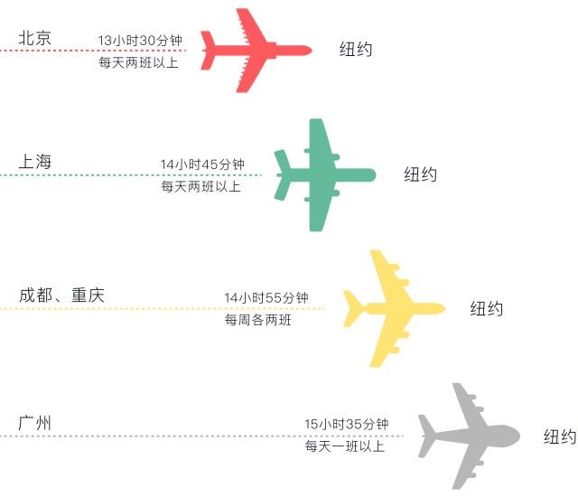 北京、上海、广州、重庆和成都提供从国内直飞纽约的航班。