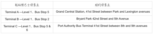 机场大巴:运行时段05:00-23:30,每班发车时间间隔30分钟。从各个航站楼到达口往外走找Airporter的小牌子就行,到曼哈顿需要$16。在曼哈顿会依次在三个点停靠:Grand Central、Port Authority、Penn Station,之后可以转地铁。