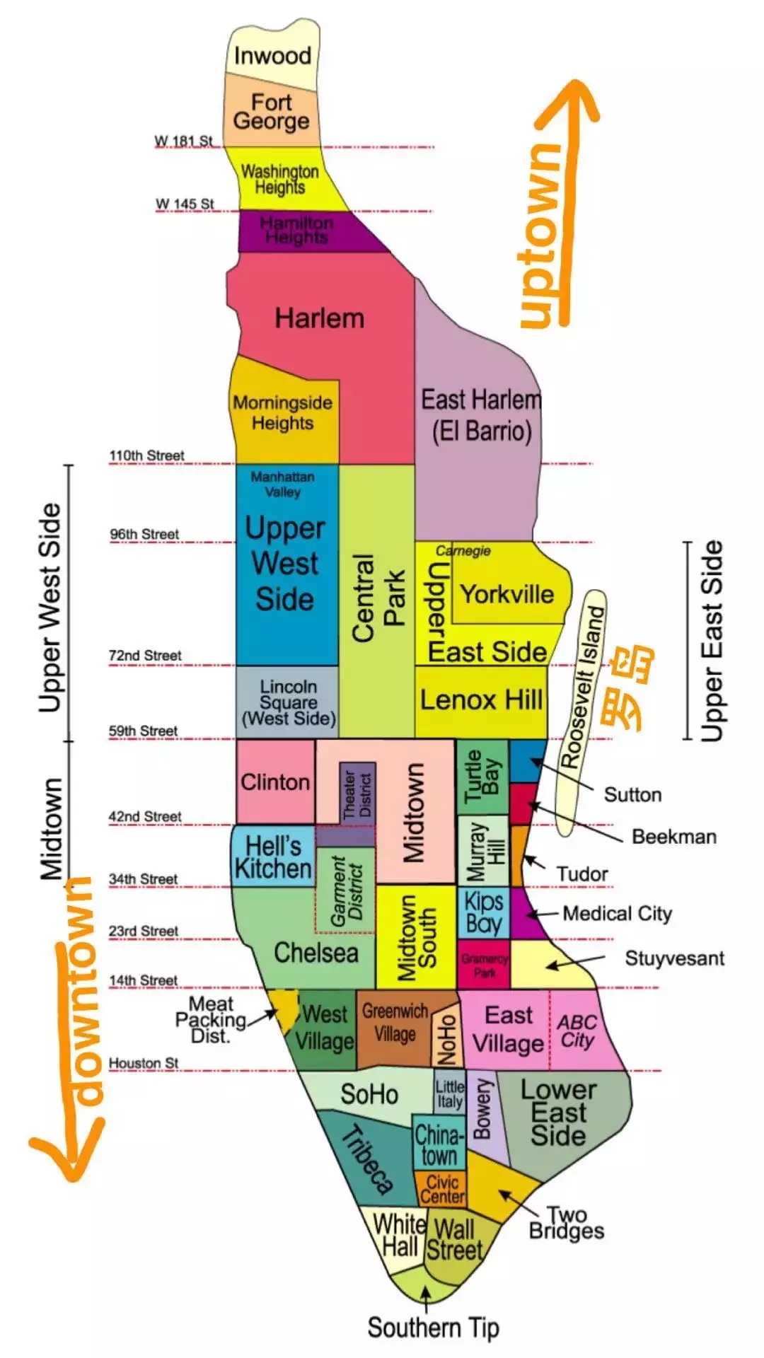 先来看看大方向上。 整个曼岛主要就是Uptown和Downtown两个方向。这个其实很好分辨,向上的就是Uptown,向下的就是Downtown。比如:从曼哈顿96街到42街就是Downtown,Manhattan到Bronx就是Uptown,Manhattan到Brooklyn就是Downtown。