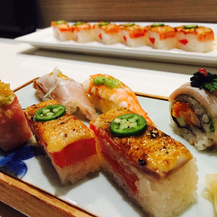 说到 Miku,他家最出名的当属招牌炙烤寿司!米饭放在方形的模具里压制,上面铺上一层新鲜三文鱼,加上一片墨西哥辣椒和特制酱汁,用明火烤炙几秒。那口感,入口即化,味道层次丰富,保证你吃起来就停不下来。然而,今天给大家说的当然不是这种所有人都知道的招牌菜,而是他家需要提前两天预订,不管颜值还是味道都不容小觑的怀石料理。