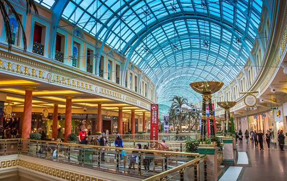 曼彻斯特特拉福德购物中心是欧洲第二大购物中心,坐落在曼彻斯特郊区,英国很多主流百货公司都在此设有分店。内部装潢典雅,玻璃采光顶棚将五个不同区域的购物广场紧密相连,包括半月型广场、巨型穹顶中庭、华丽的商业街、欢乐庄园和东方美餐厅休闲大厅。休闲餐厅区号称欧洲最大的美食广场,有60余家餐厅,可同时容纳上千人用餐。美食广场以蒸汽船为主题设计,在此用餐仿佛置身于一艘巨大的邮轮之中,以此向工业革命和曼彻斯特大运河致敬。美食广场有多个主题餐区,包括中国、新奥尔良、埃及、威尼斯、纽约及摩洛哥等餐饮区。