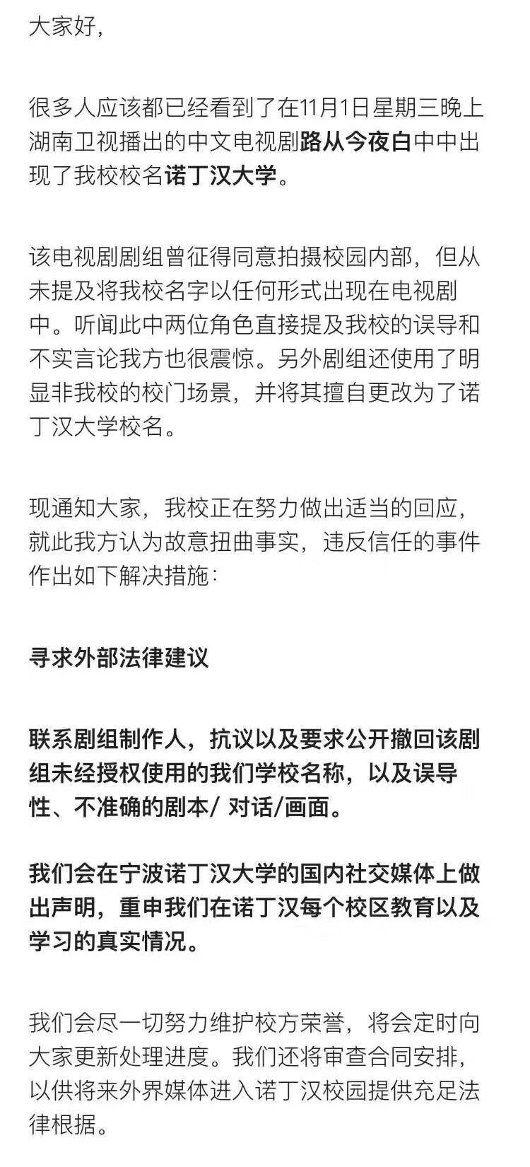 截至11月2日下午18点,#路从今夜白剧组请道歉#这一话题在新浪微博已引起超过600多万点击阅读。 而在11月2日下午18点37分,诺丁汉大学收到来自剧组的致歉信。
