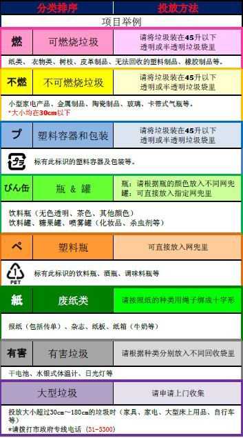 每种垃圾的回收时间都不一样,比如:可燃垃圾(每周一三五)、不可燃垃圾(每周六)、资源垃圾(每周四)、粗大垃圾(每个月20日)等等……